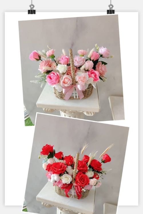 Artificial & soap flower basket: (choice of red, pink or purple arrangement)