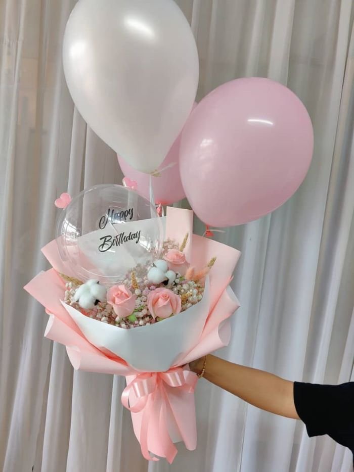 Happy Birthday balloon & 3 stk of Fresh Rose Bouquet tie with 4 pcs helium balloon