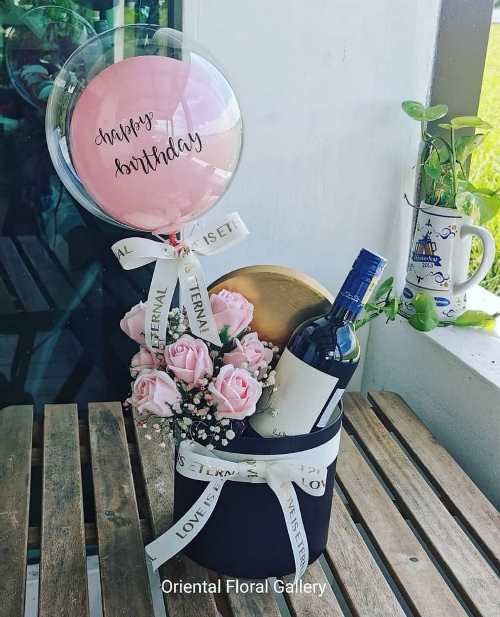 Import wine with soap flower & Balloon in box (Choice of Birthday, Anniversary or Congratulations balloon)